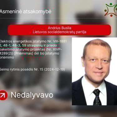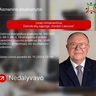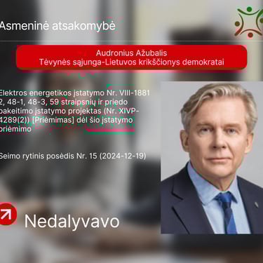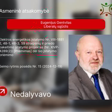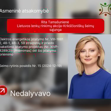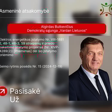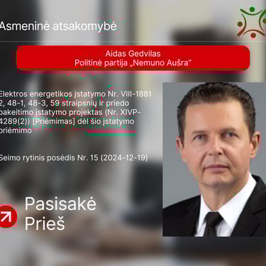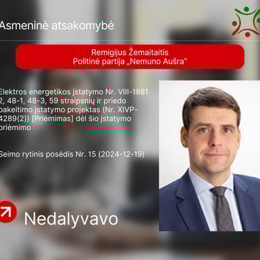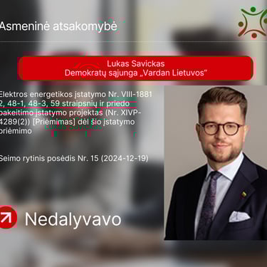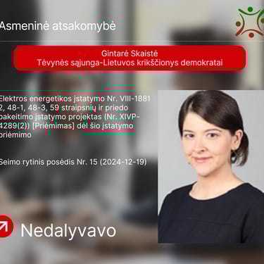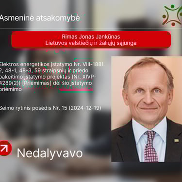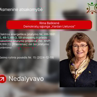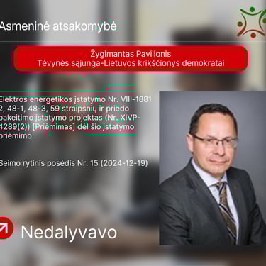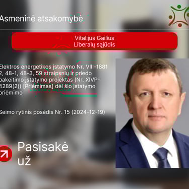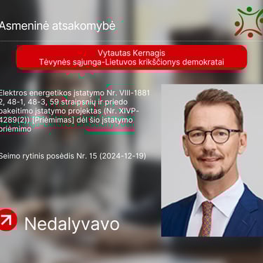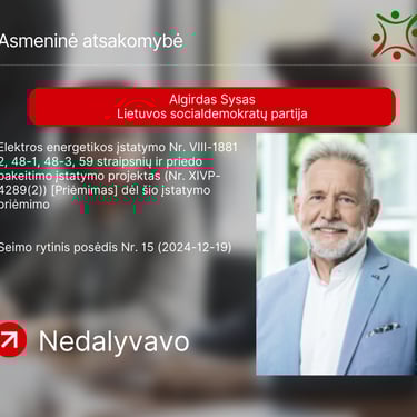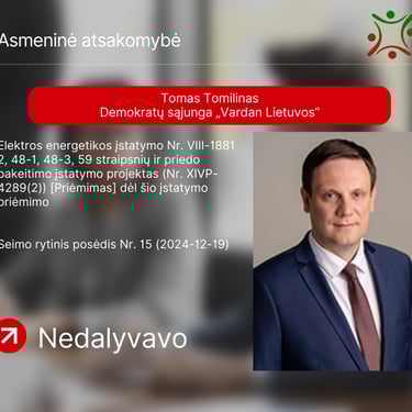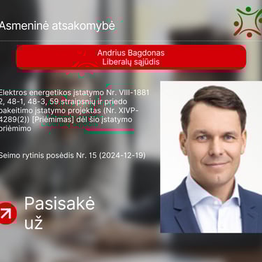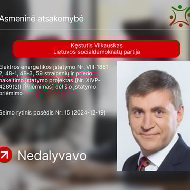 Prie šio straipsnio rasite visų Seimo narių nuotraukas ir jų vaidmenį balsuojant dėl elektros energetikos įstatymo pakeitimų. Sužinokite, kaip balsavo jūsų atstovas – ar jie palaikė sprendimus, galinčius paveikti elektros kainas ir skaidrumą?
